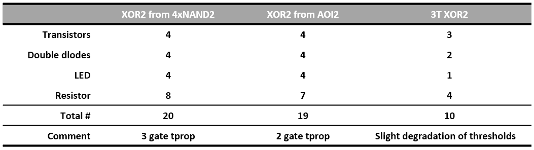 An LTL version of a XOR2 gate based on a cross coupled transistor pair is shown above. First, this device has an output inverter to restore the low level. An input diode and resistor is added to avoid current sinking during high. To fix the threshold levels, two additional diodes were added (D1, D3). LEDs cannot be used in this place, because there are other elements in the current path (D1,D2, output transistor from preceding gate) that add to threshold voltage. The threshold level is still defined by the differential voltage between two inputs. This is still of concern, but a little less relevant now since the output levels have been restored. Assuming the input low level is 1xVCEsat, the threshold level is equal to VD1-VD3+VBE+D2+VCESat: 0.7+0.7+0.2 ~ 1.6V. This is much higher than the 0.7V of the bare transistor, however still not the same as the LTL threshold levels.