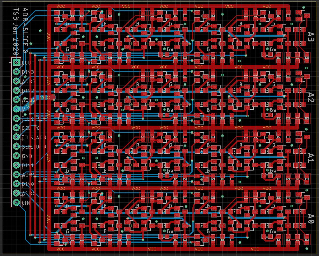 The final PCB layout is shown above. I managed to fit a four bit wide slice of the adress path into one 8,5x7cm^2 PCB.
