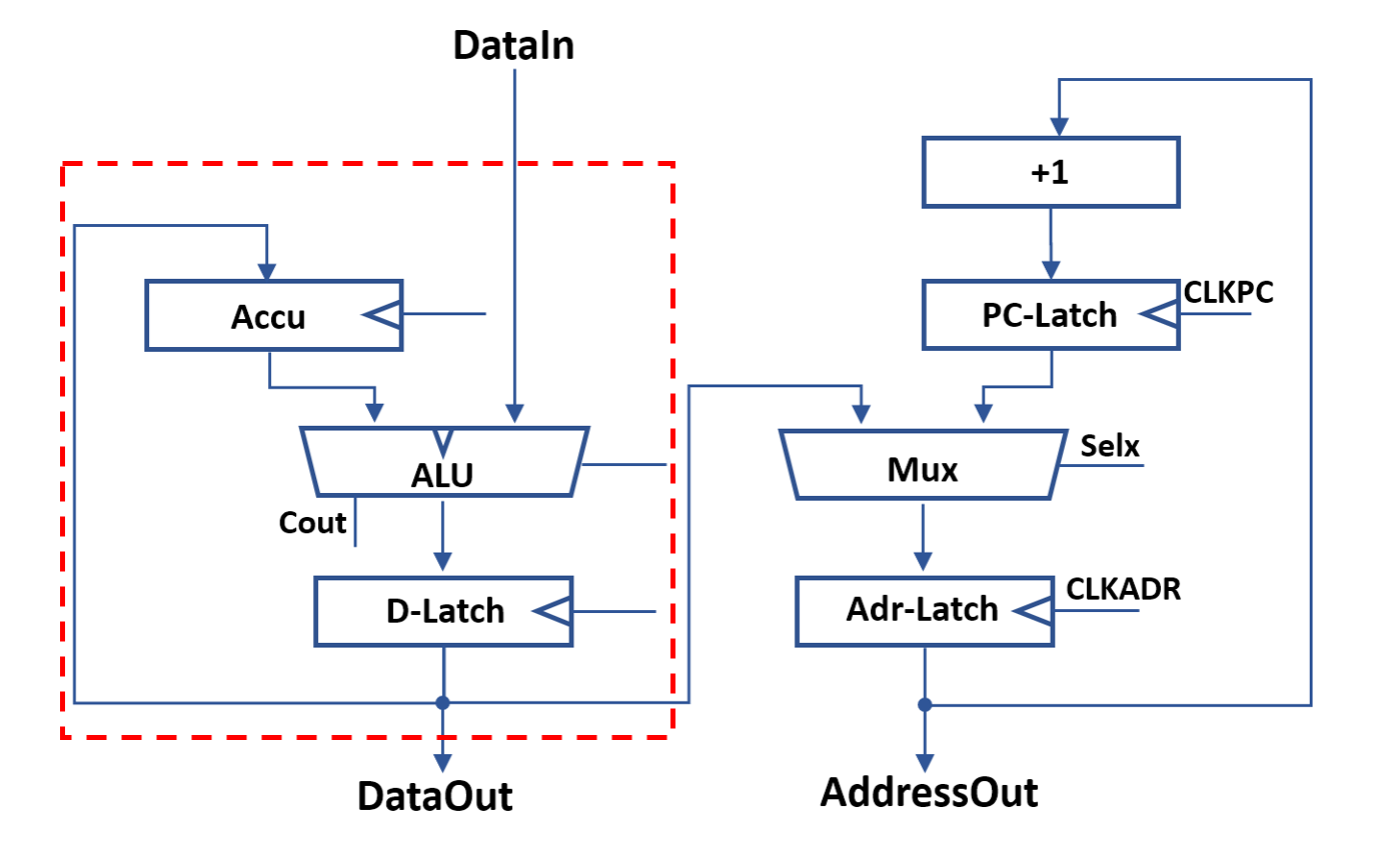 The data-dapath encompasses the left side of the system design. The original M-CPU ALU was rather simple and only supported the two operations that were needed directly by the ISA: (Y,Cout)=A + B, Y=A NOR B.
