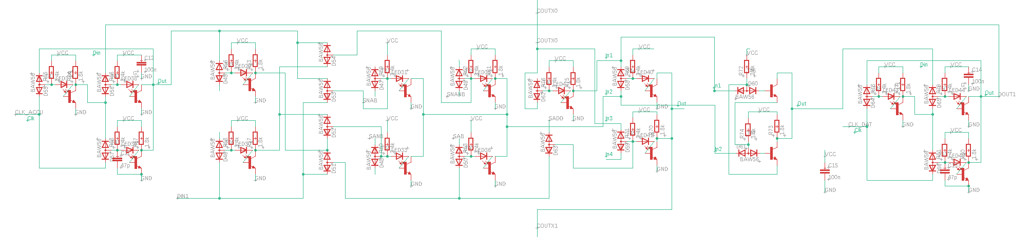 The circuit of one slice of the ALU board is shown above. The number if dual-diodes is quite high in this design due to wide-input AOI gates used as multiplexers for the boolean units. The XNOR gate on the right side is based on a cross coupled transistor pair. No LED could be used here due to stacking of several PN junctions in the current path.