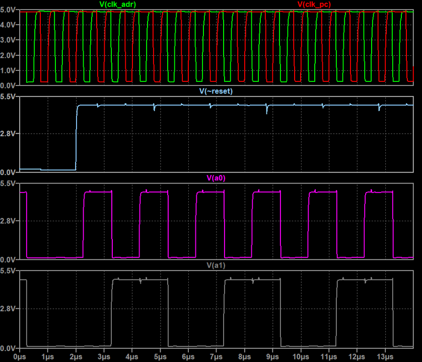 Six of the bit slices were combined in a testbench to test the design of the full width datapath. A two phase clock is needed to alternatingly clock both latches. In this setting the circuit is configured to reset the PC and then increment it with each clock cycle.