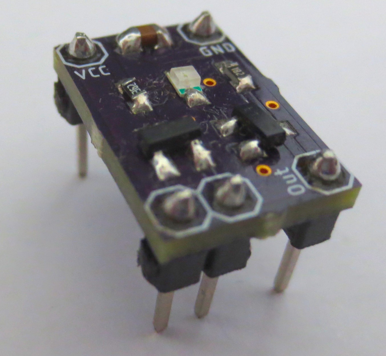 I designed a neat breadboardable LTL-NAND2 gate to test the design in hardware. You can find the PCB layout and a photo of the finished product above. I use a BAW56 dual-diode in a SOT23 package for the input diode. This form factor is much easier to handle than single diode SMD packages and there is no cost disadvantage. You can see the LED in the center of the PCB. I made a few variation with different LEDs: green (high Vf) and red (lower Vf) and different collector resistors.