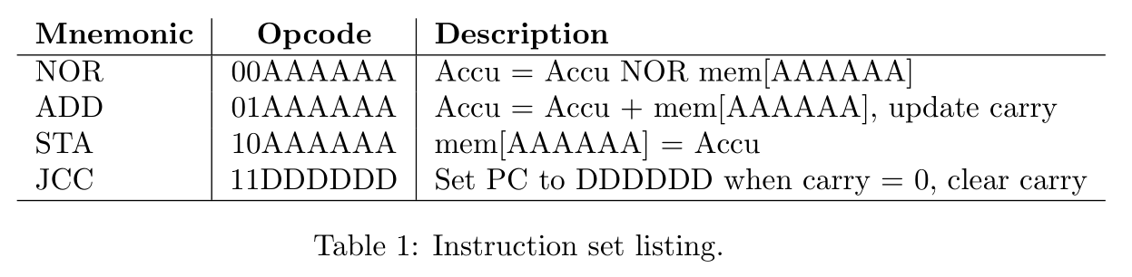 The MCPU programmers model is based on two registers: Accumulator and PC. The ISA consists of four instructions in a fixed encoding that is based on a two bit opcode and a six bit memory address. This ISA can be directly mapped to the datapath shown above with minimal control overhead. See MCPU link for more information including assembler, emulator and example code.