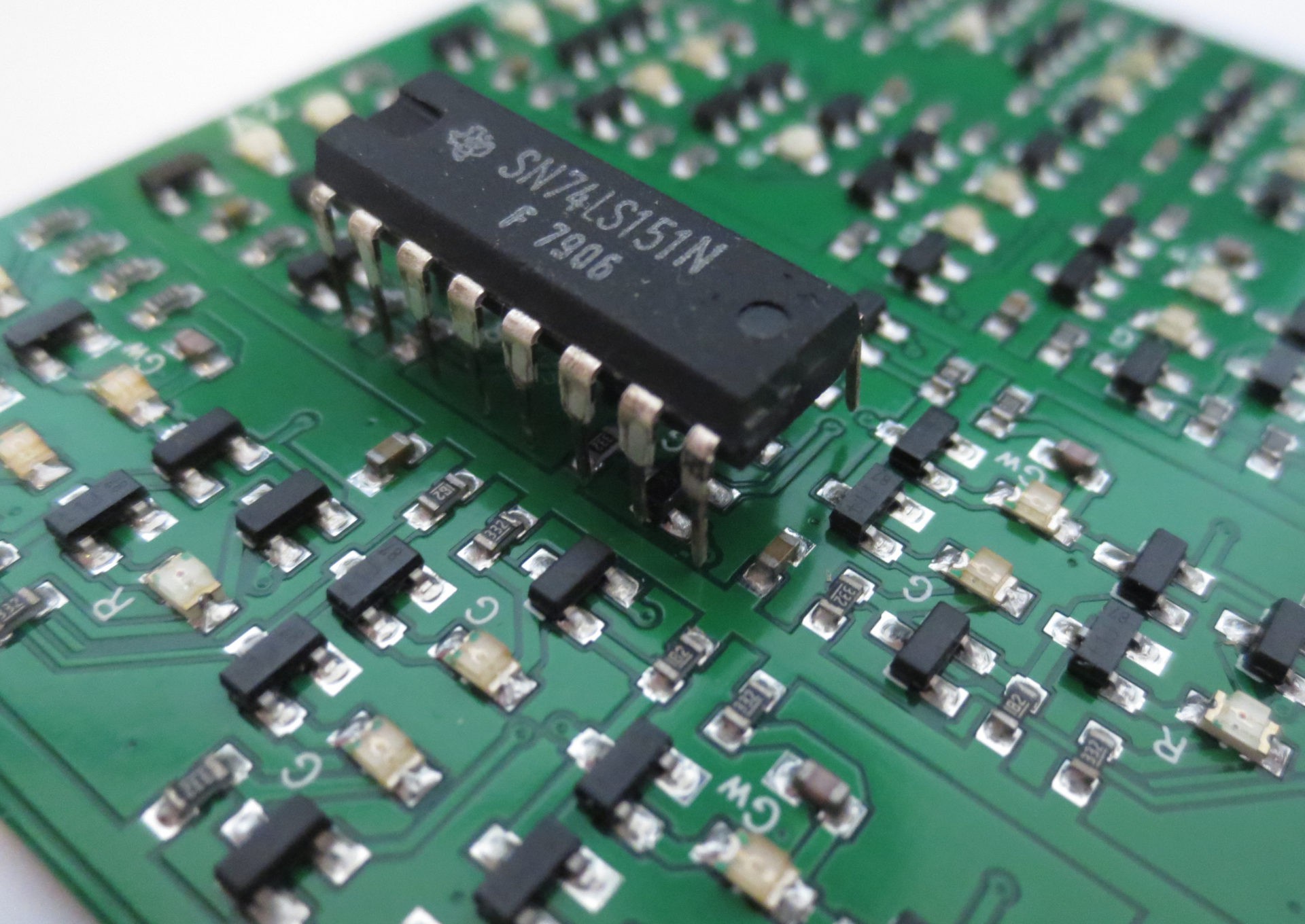 A populated PCB is shown above. Since I am not too fond of placing all those parts by hand, I used an SMD assembly service. The finals stats are: 52 transistors, 48 diodes, 24 capacitors, 56 LEDs and 88 resistors.