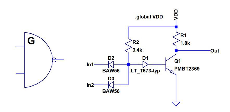 The basic gate of LTL is the NAND2 gate. Symbol and circuit shown above. In my final design I used gates with different threshold level so I added a “G” to a high threshold device with a green LED.