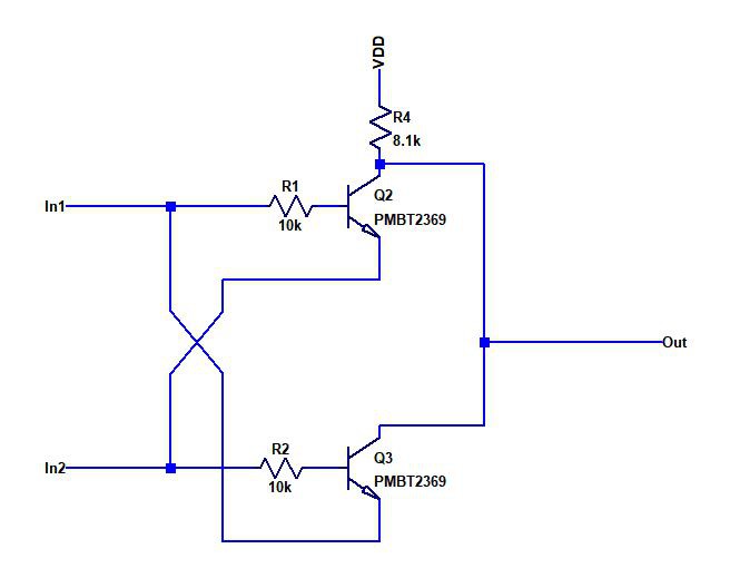 One approach that has been discussed at length at the hackaday TTLers is to use a cross coupled transitor pair, as shown above in a XNOR2 gate. This method is really tricky and drastically reduces the part count. In context of LTL there are a few challenges, though: The gate above is basically an RTL gate and will sink current when the input is high, which leads to a reduced fan-out. The threshold voltage is not defined relatively to ground, but in reference to the second input. The gate switches when the voltage difference between both inputs is equal to Vbe (~0.7V) - very different from the normal LTL threshold. Also, the output low level is 2xVCEsat instead of 1xVCEsat. The combination of all these effects leads to some headaches when designing circuits with several of these XNOR2 gates as they will start to influence each other and the noise margin degrades. A few changes have to be introduced to make this type of gate a bit more compatible to LTL.
