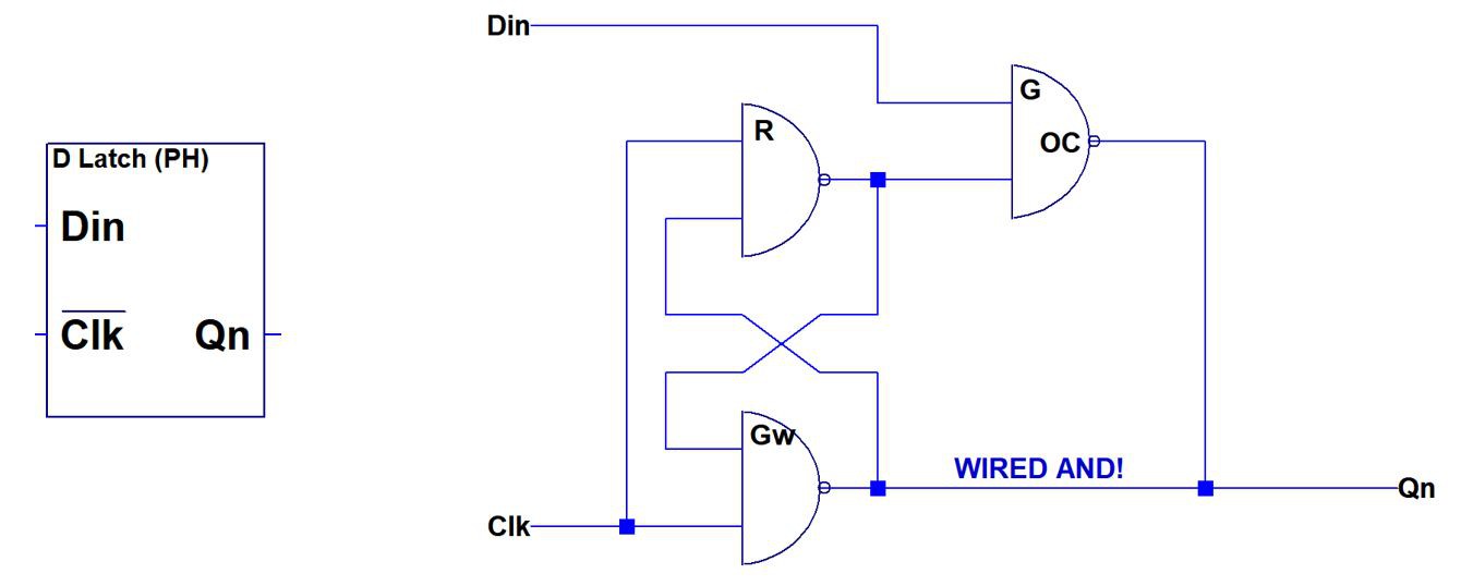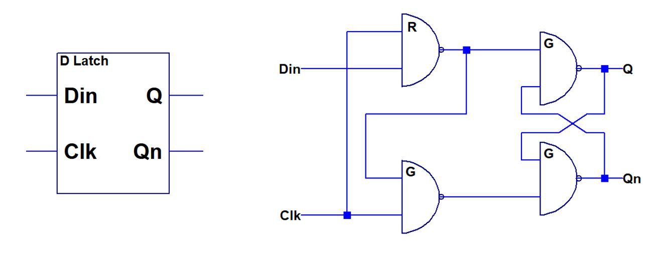 A commonly known minimal representation of a gated D-latch in NAND2 is shown above. See also Wikipedia article. A nice propery of this design is that it only requires a single clock input and has both inverted and non-inverted data outputs. Data from Din is forwarded to the output while Clk is high. The state of the latch is frozen on the high->low transition of the clk and held while clk is low.