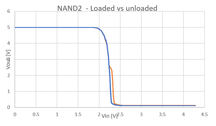 To build up more complex circuits it is also important to study the effect of output loading. The figure above shows the NAND2 gate with floating output and with another NAND2 gate connected to it. The threshold is slightly shifted for the loaded output, but not to a level of concern.