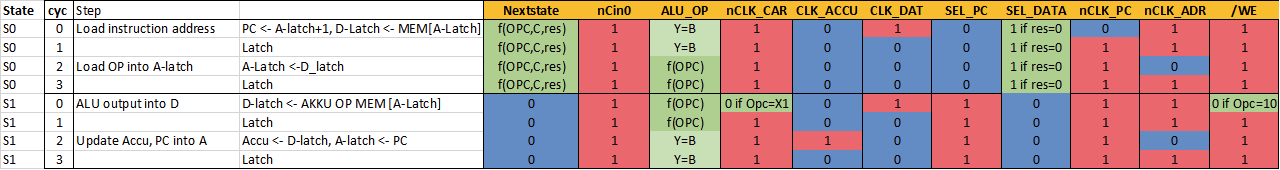 As a first step, I mapped all control signals to states and clock sub-cycles. The LCPU is still able to execute every instruction in a maximum of two clockcycles, despite switching from edge-triggered FF to latches.