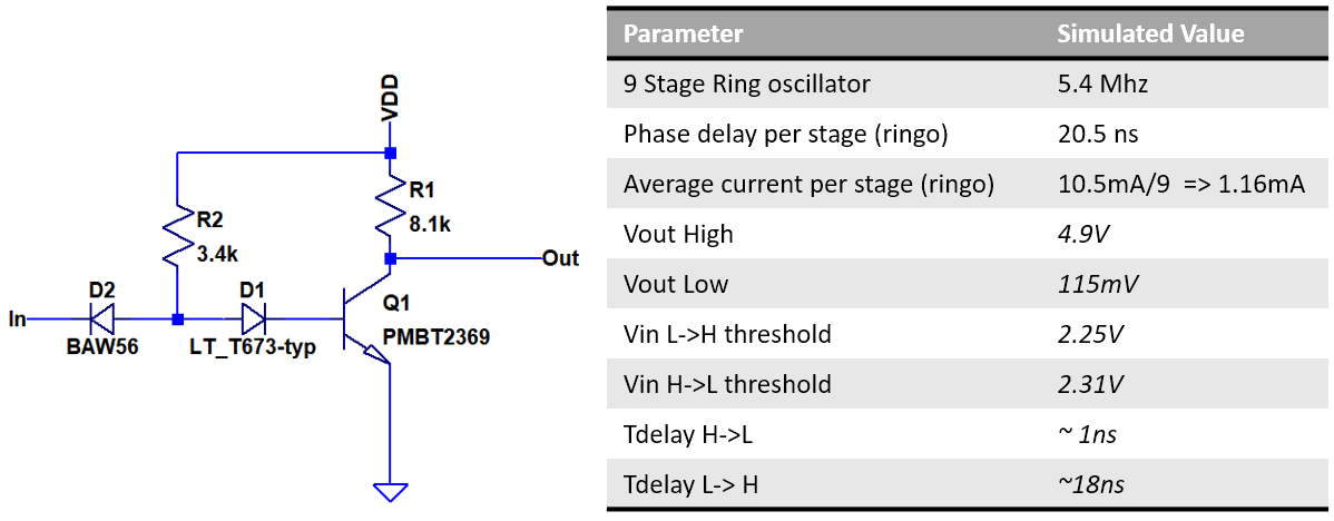 Final parameters of the simulated inverter are shown above. The relatively high L->H delay is owed to the use of a relatively large collector resistor. Note that the threshold voltages are almost centered between the 5V supply and ground, maximizing noise marging and making the gate compatible to CMOS logic levels.