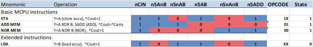 The list below shows the control signal configurations that were tested. Only the first three cases apply to operations that are used by the MCPU ISA. In addition, Y=B is needed for address loading. The other operations would allow for a later extension of the instruction set.