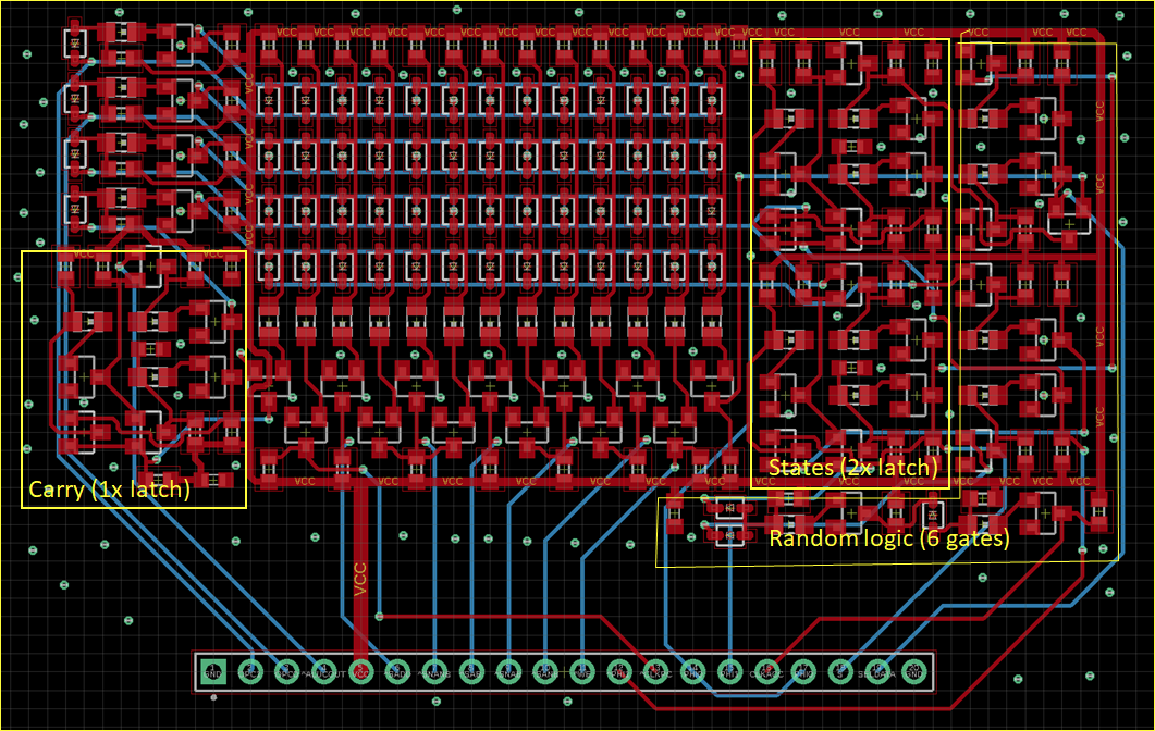 Above you can see the an image of the hardware while it is operating. The red LEDs are part of the low threshold gates in the latches, while all other gates use green LEDs to set the threshold to ~2.3V.