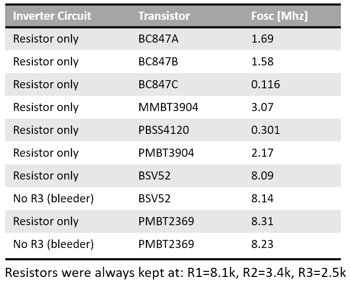 I built two versions of the ring oscillator: One with red LED and one with green LED, both using 1.8k collector resistors.