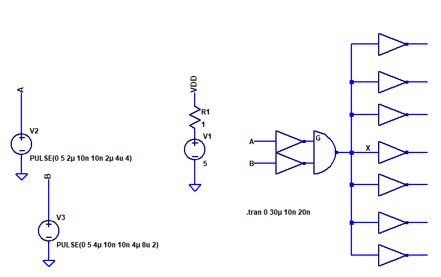 Every gate was tested in a simple testbench in LTspice. I arbitrarily chose a fan out (FO) of 7 for the test case, although this does not occur in the real design.