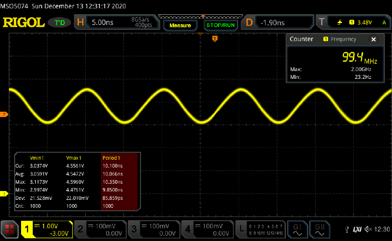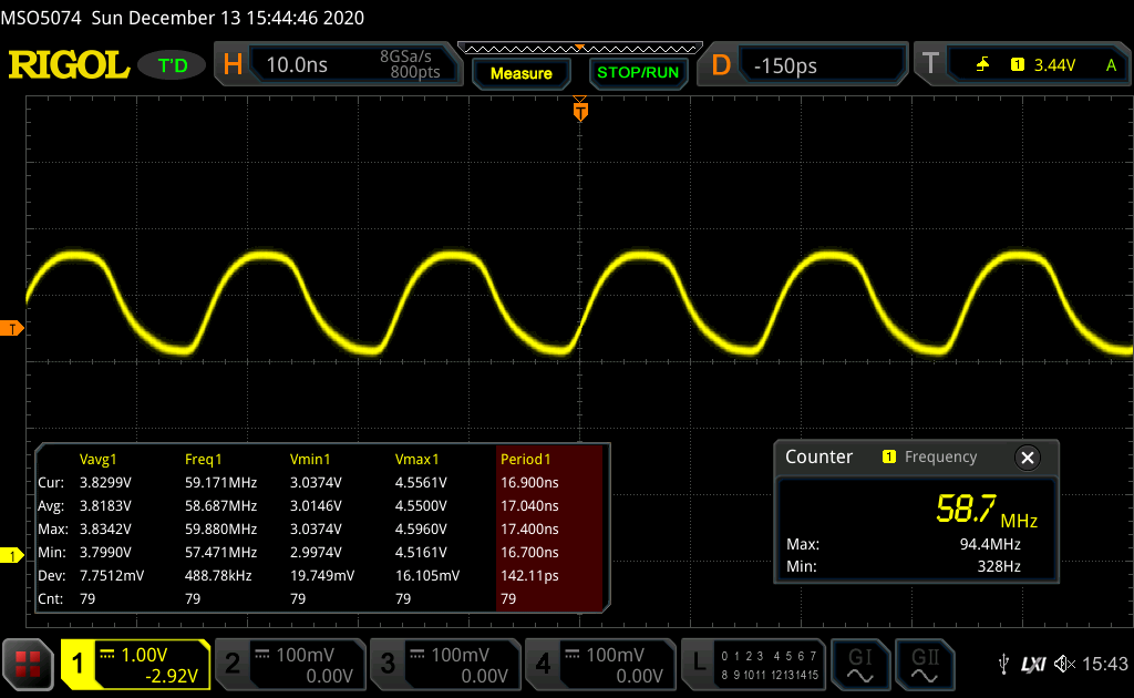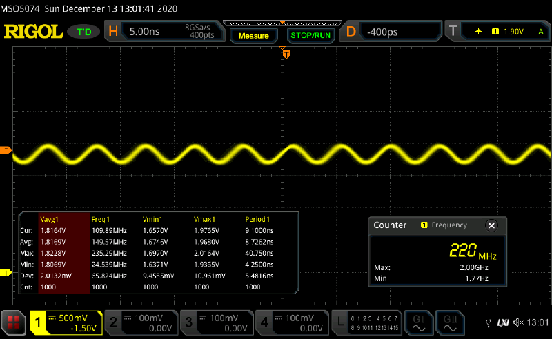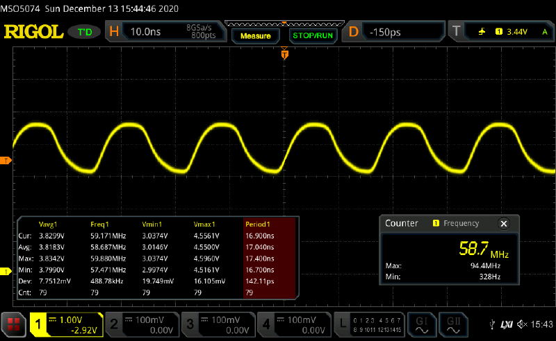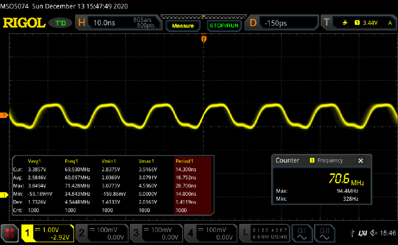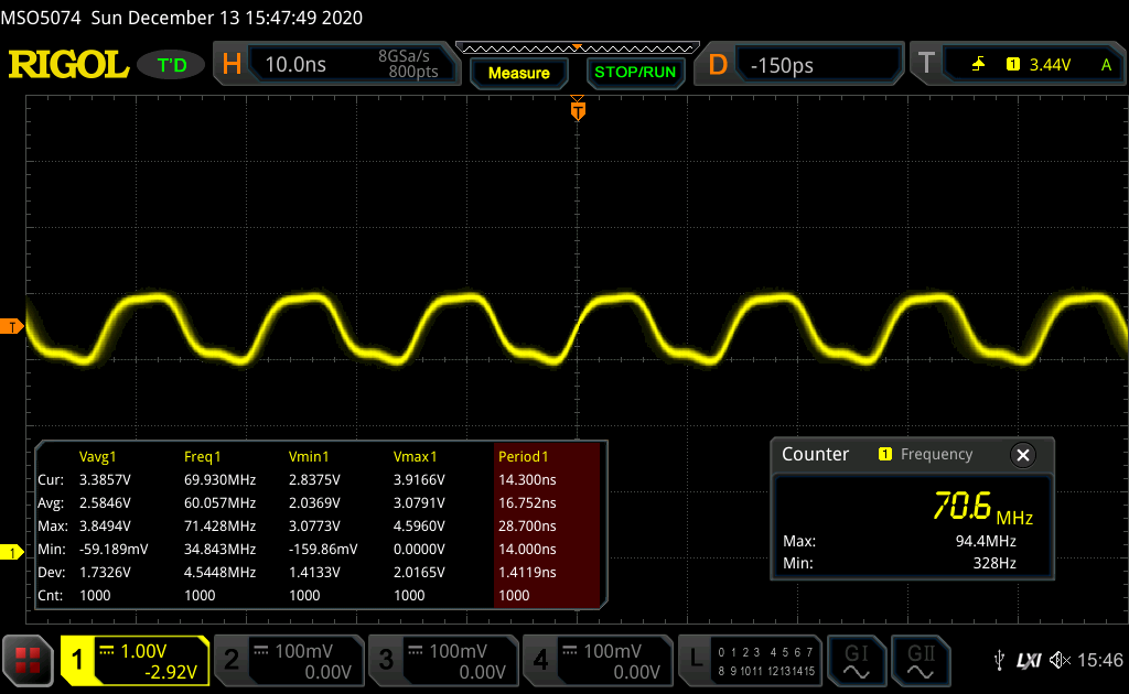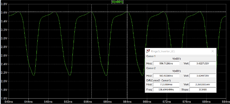 Oscillator frequency is 138.7 MHz, which means that the tpd is 720ps. There is some overshoot, which appears to increase voltage swing.