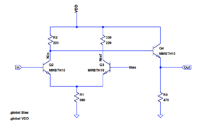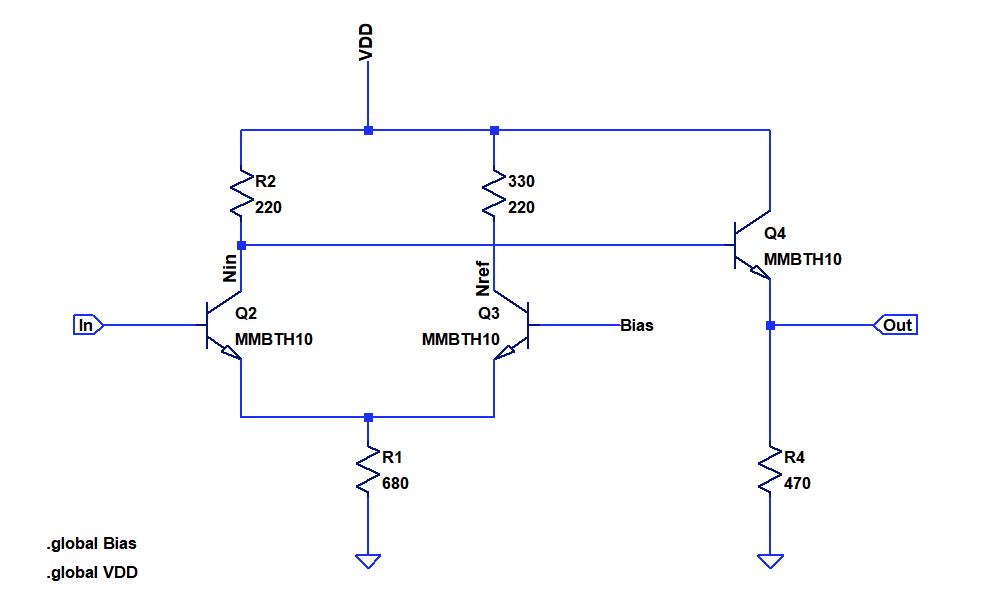 Let’s ponder about the right side of the differential pair (Q3). It does not only consist of a resistor and transistor, we need a static bias reference in addition. This adds a lot of components to what could be a simple RTL or NMOS inverter.