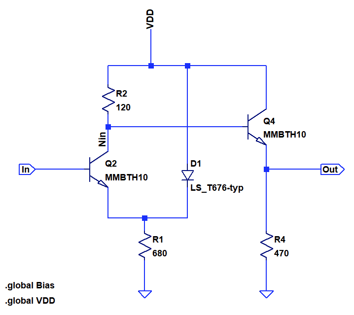But who says we have to form a differential pair from two identical transistors? The circuit above shows an inverter formed from an assymmetric differential pair consisting of a LED and a bipolar transitor. The benefit of this is that it saves one transitor, one resistor and the bias reference.