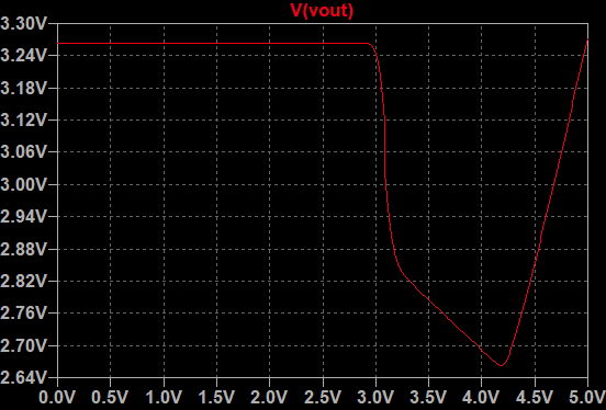 The plot above shows the input-output relationship of the inverter. The threshold level is at 3.0V, the high level is at 3.25V, while the low level is at 2.8V. The output voltages increases again if the input is driven far above Vh. This behavior is similar to ECL.