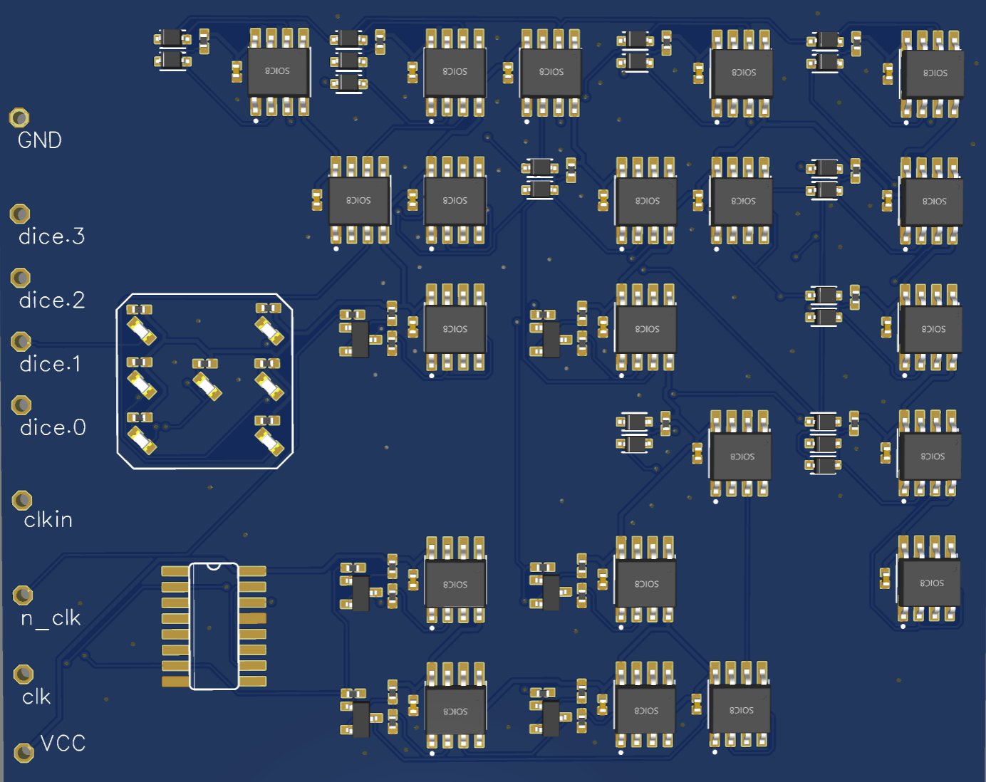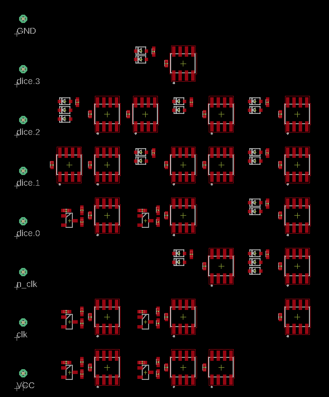 The naming of this type of gate is debatable, but I call it “ANDN2” in my library. It is actually fairly easy to implement this gate in PCBflow as well. I made a version of the dice where I enforced the AND2 and NOT gate to be the only type of logic gate being used:
