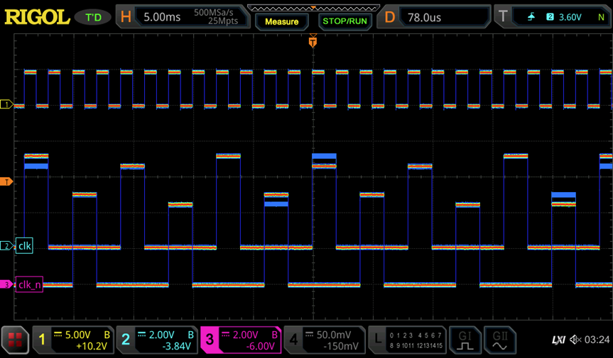 First step is to test the clock generation. The scope image below shows how the CD4017 generates the nonoverlapping two phase clock (clk and clk_n) from the input clock signal. It appears that the CD4017 is able to operate only up to ~1.3 MHz, so maximum generated output clock is around 300 kHz. This is not a big issue since this is still far beyond the capabilities of NE555 logic.