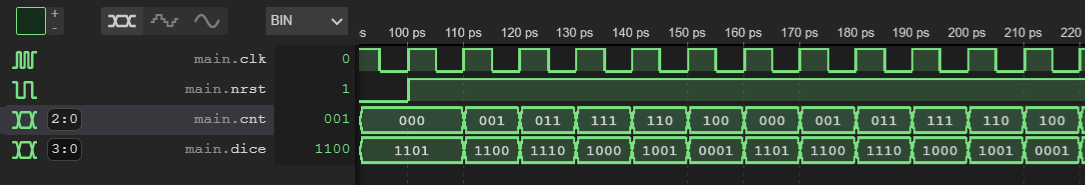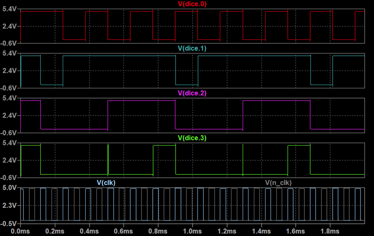 Edit: Digital simulation output is shown below. Please note, that the dice output is inverted since the LEDs are active low. I found a tiny bug, which is fixed above.