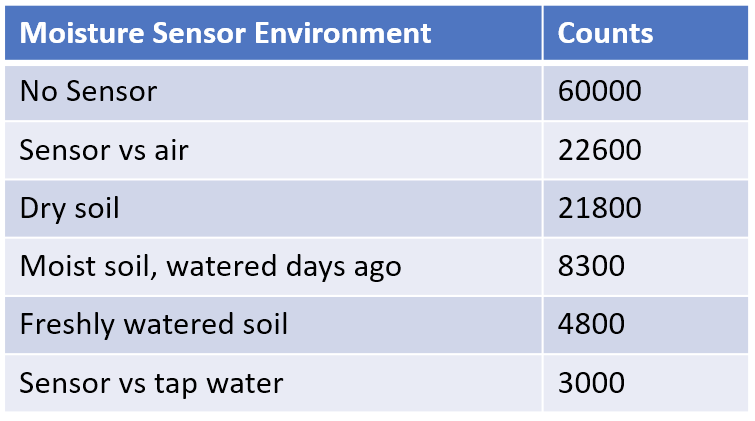 The table above shows counts for a counting time of 40ms. The sensor capacitance vs. air is only about twice as high as the parasitic capacitance on the breadboard (“no sensor”). The counts strongly decrease in presence of water and its easy to distinguish a freshly watered plant from one that already dried up slightly.