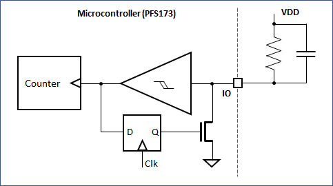 The image above shows my interpretation of the “C-type” operation of the RFC. Basically it consists of a schmitt trigger and a ground switch. If an RC-couple (as shown) is connected between the IO-pin and the positive supply, the input voltage will slowly increase according to the RC time constant. If a certain trigger voltage is reached, the ground switch will short the input to ground until the lower trigger voltage is reached. Each time this happens, the counter increases by one. Effectively, this circuit forms a relaxation oscillator.