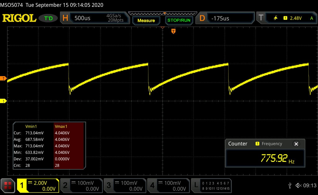 It can be cleary seen that the charging of the RC element follows an exponential. The upper trigger voltage is 4V, the lower trigger voltage is ~700 mV. The origin of the ringing at the lower voltage is not clear to me, it seems to be an artifact of the RFC peripheral.