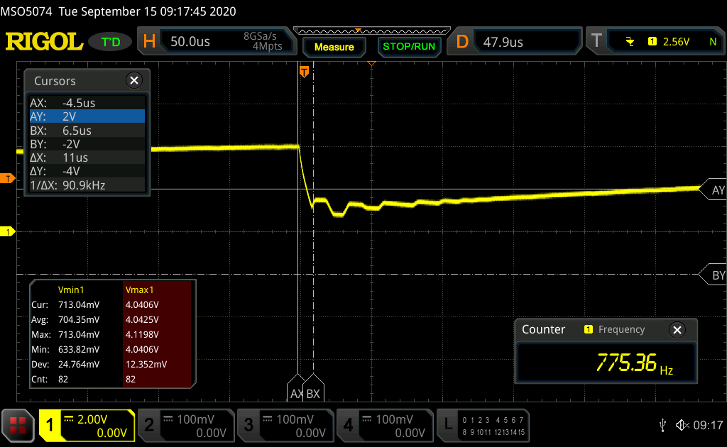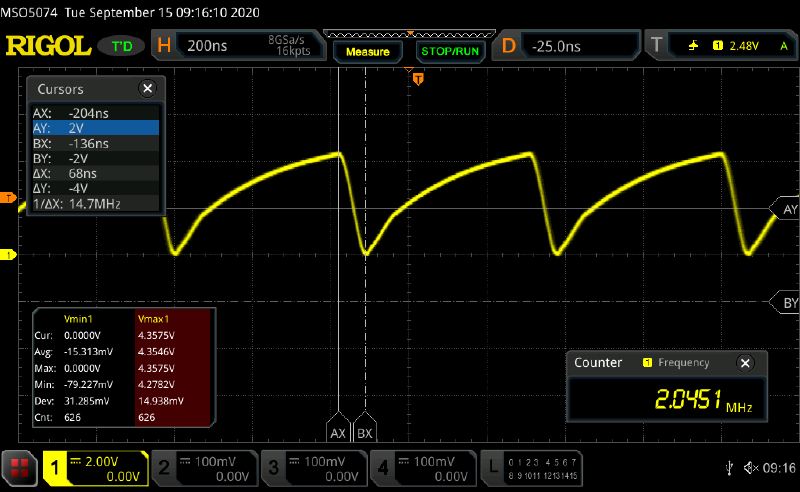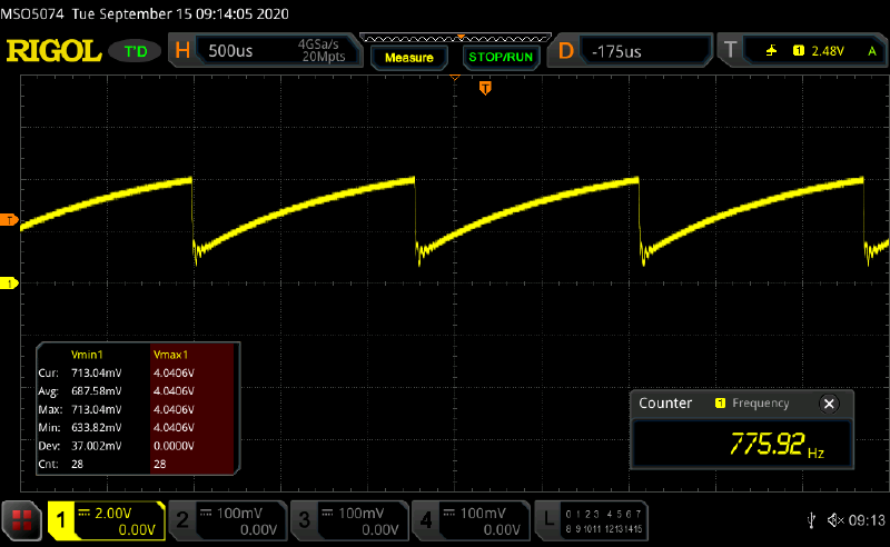 The scope picture shows the voltage on the RFC pin during operation. In this case a 100nF capacitor and 10 kOhm resistor were connected in parallel to VDD.