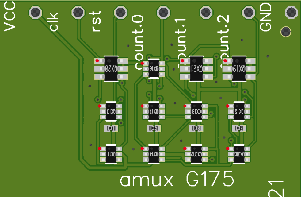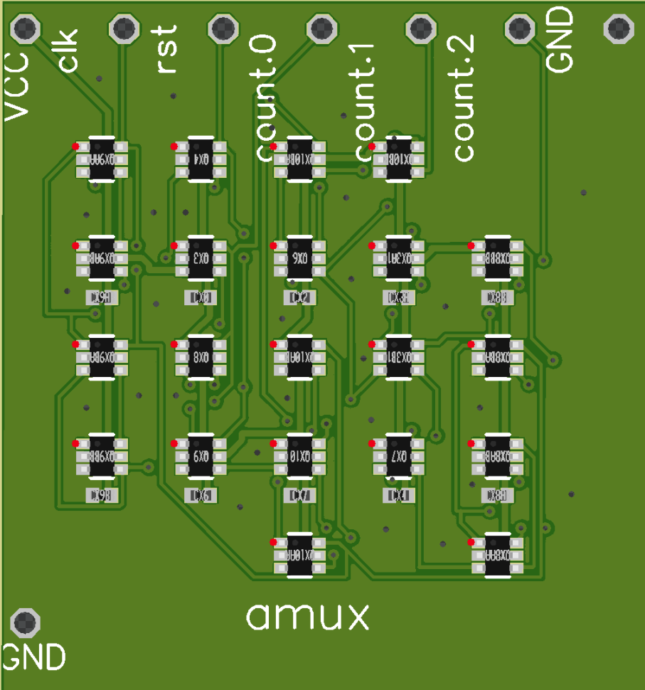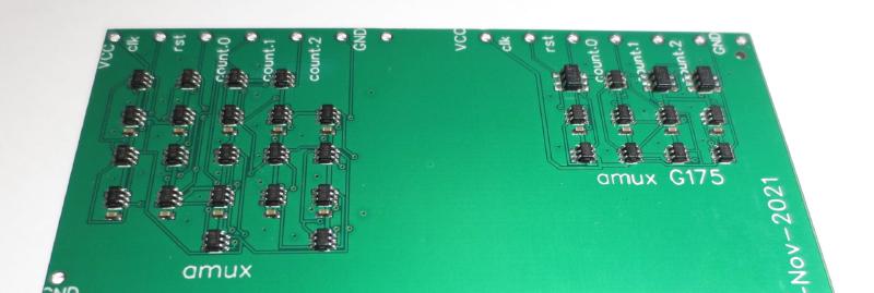 Next try at analog multiplexer logic: In addition to fixing the bug in the latch, I also added a few optimizations to the logic style: DFF are now taking only 4 amux and I introduced a few additional gate types (ANDN2, ORN2) that helped to reduced logic complexity. As a result, the counter now only takes 21 amux ICs, instead of 26 before. Furthermore, decoupling capacitors are automotically inserted now.