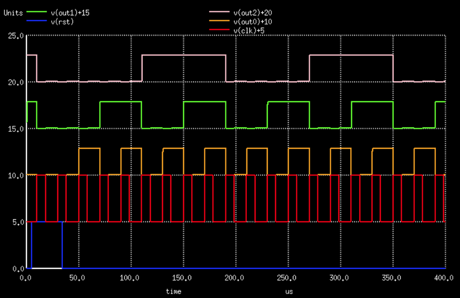 The implementation with 7 transistor D-flip flops is shown below. It is much smaller, requiring only 41 transistors and 88 resistors. Due to this, the average current consumption is also a bit lower at 35 mA.