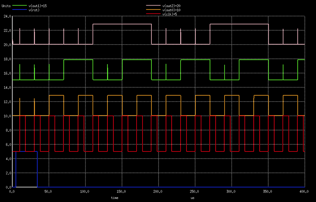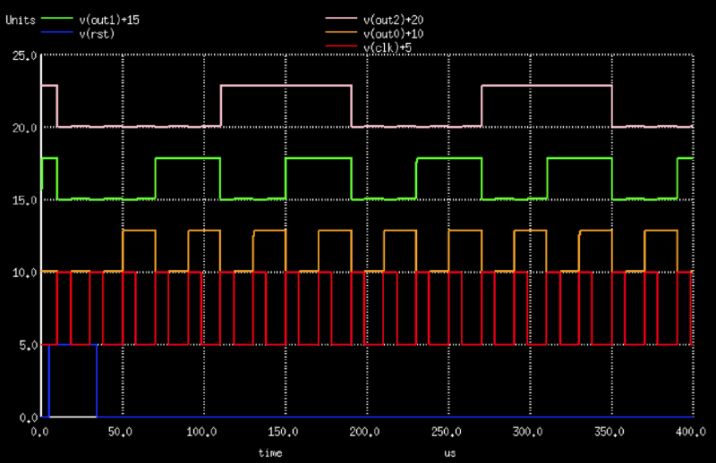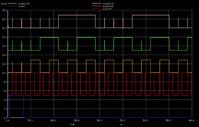 Analaog simulation of the counter example after synthesis. Everything seems to work fine. The spikes of the polarity hold latch are gone. Upon closer inspection one can see some cross talk on the logic levels. This may be caused by the pass gate which adds an uneven load (2x Vbe) one some gates.