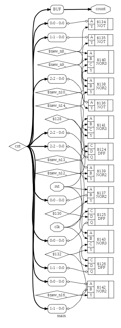 I used the counter.vhd example as a test subject. Two implementation can be seen below. The upper design is based on 15 transistor DFF, the lower one on 7T DFF. The difference in complexity is quite obvious.
