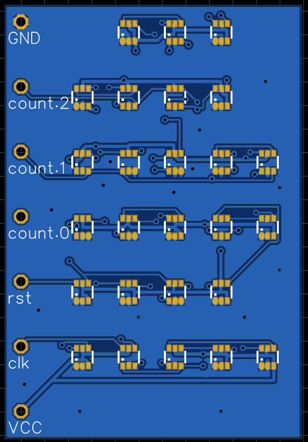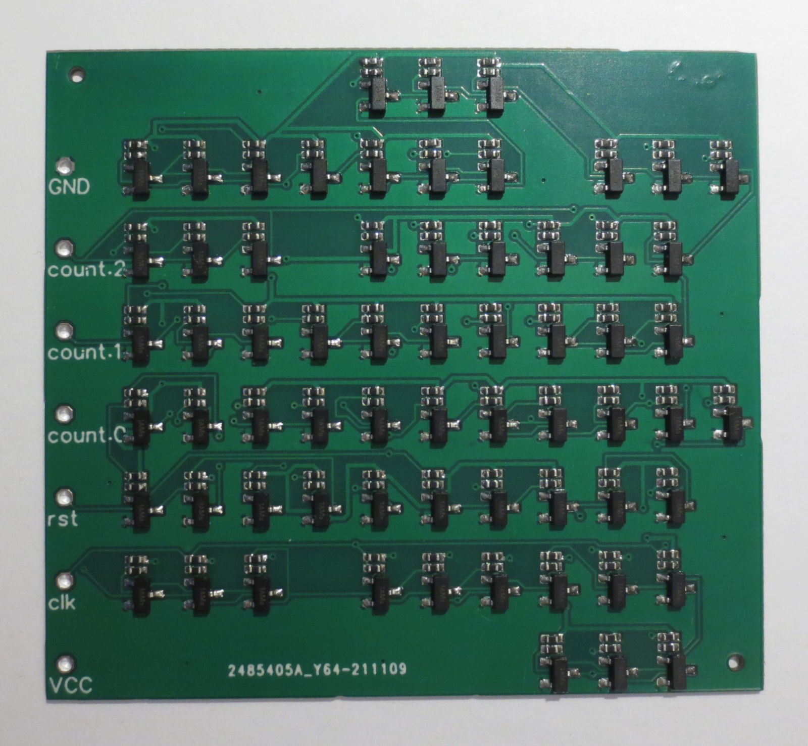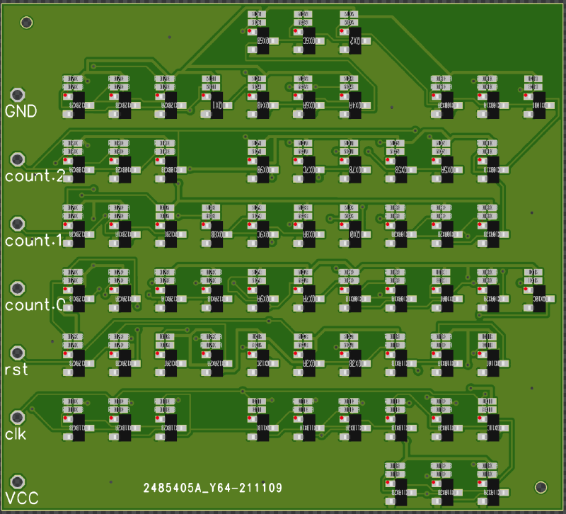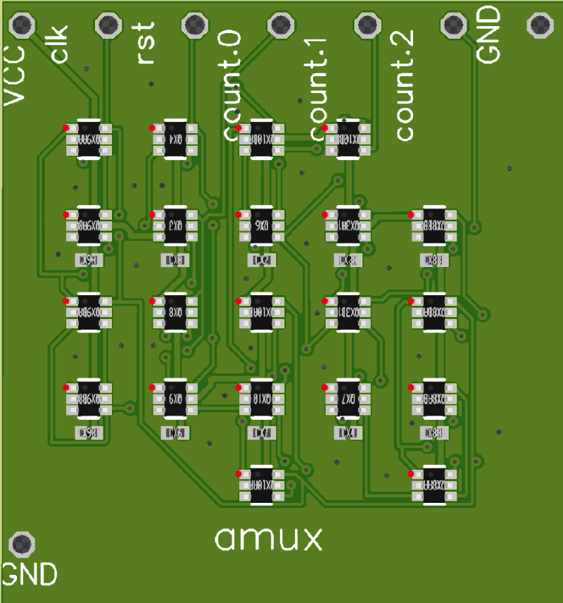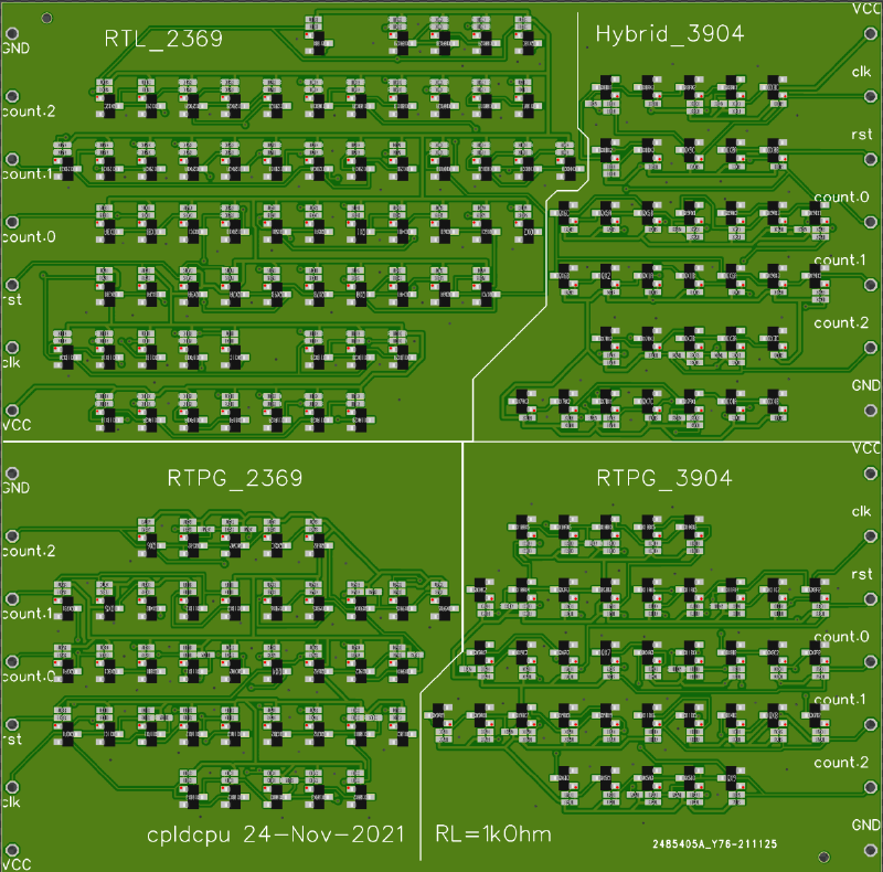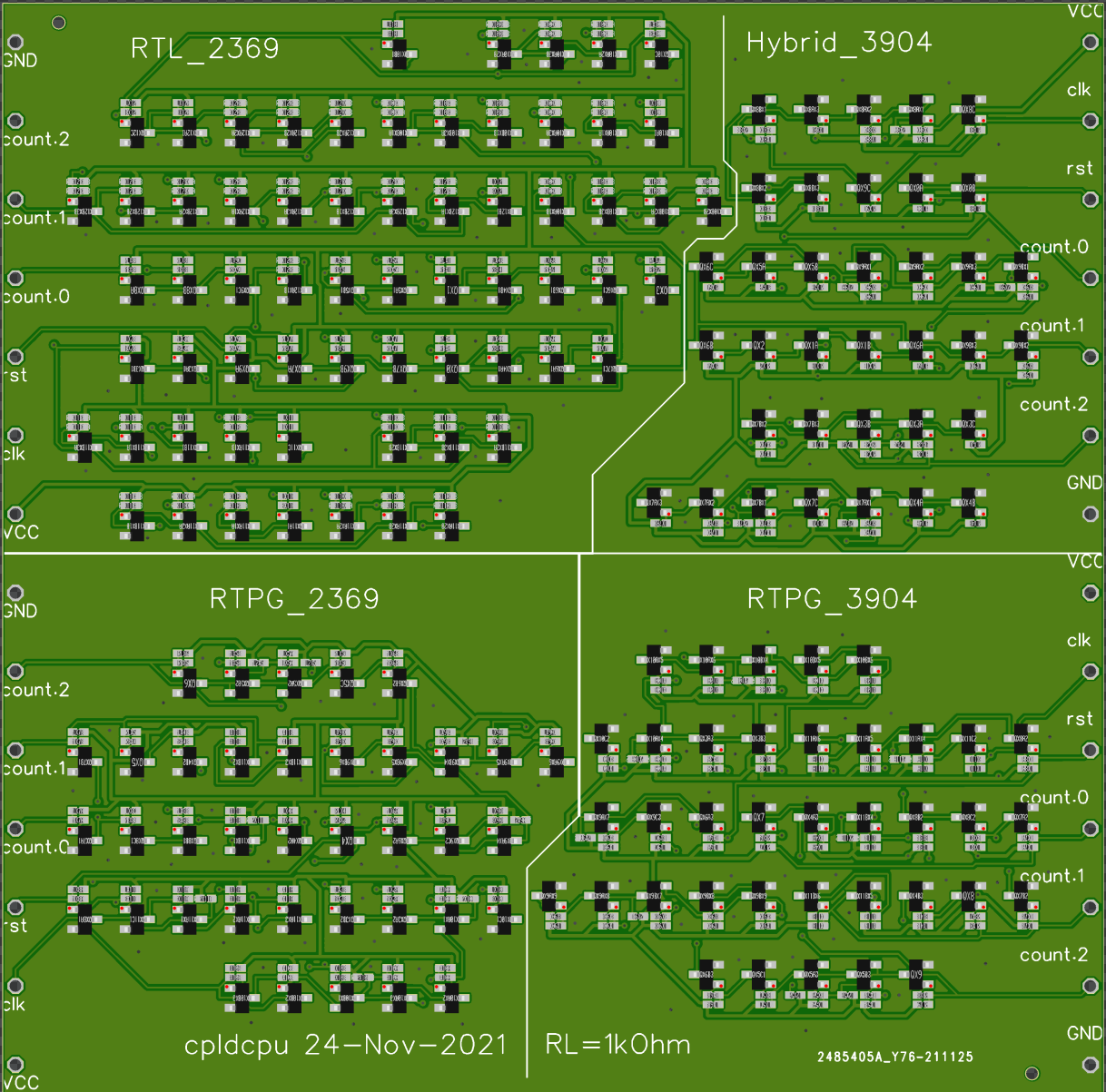 The flow is, of course, not limited to resistor-transistor-logik. In the meantime, I implemented analog multiplexer logic and already received a first PCB with the counter implemented in that logic style. The generated PCB is shown below. The analog multiplexers (BL1551) come in a tiny SC70 package and leave ample space for routing. The implementation of logic gates with multiplexers is quite efficient, hence only 26 devices are needed.