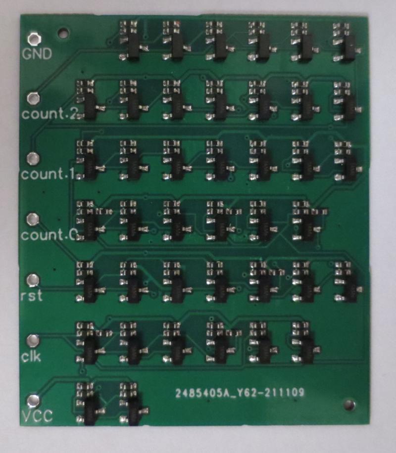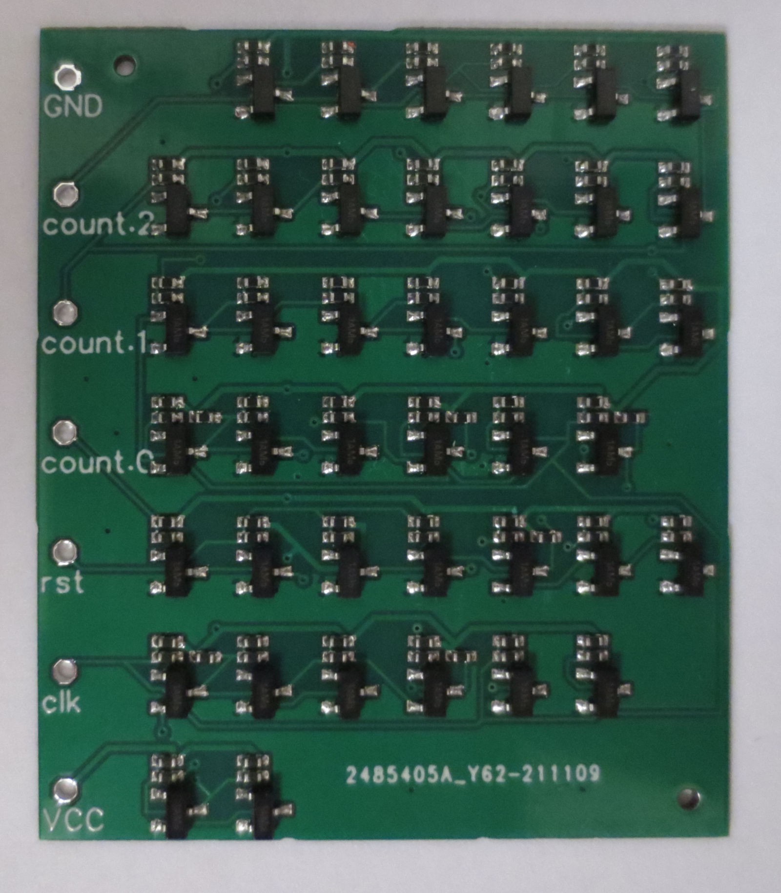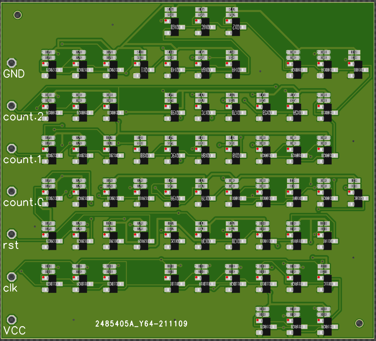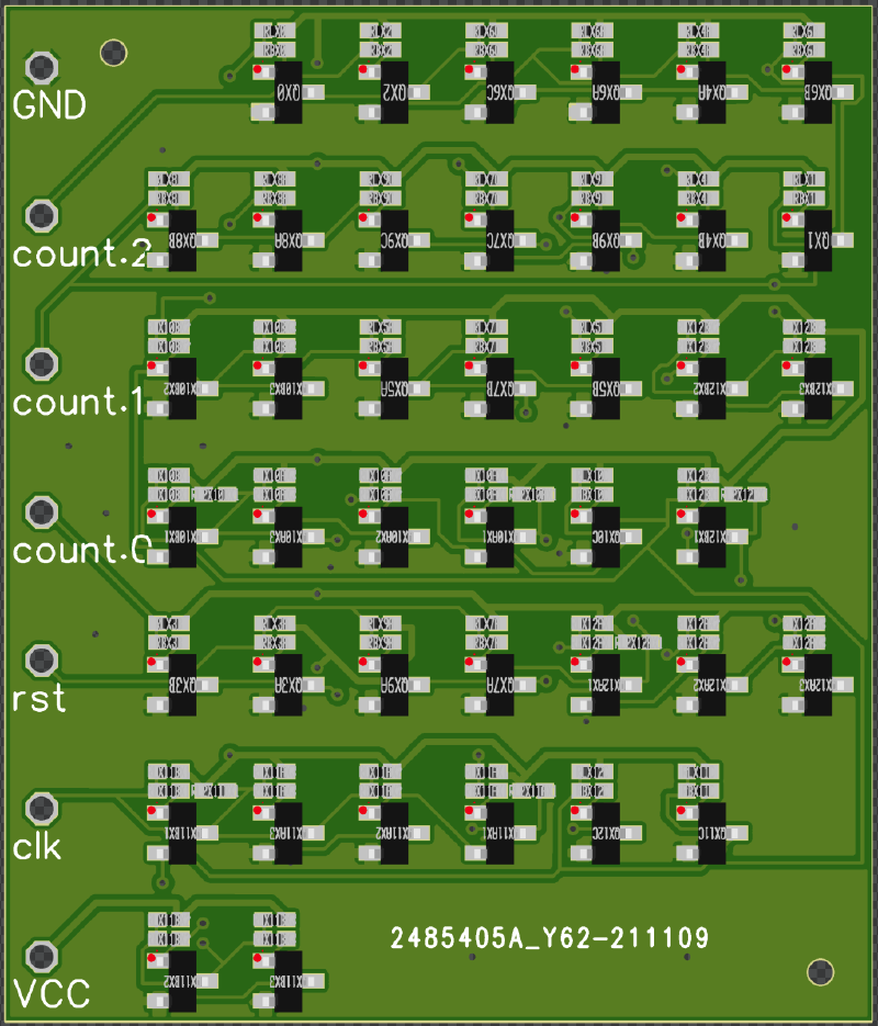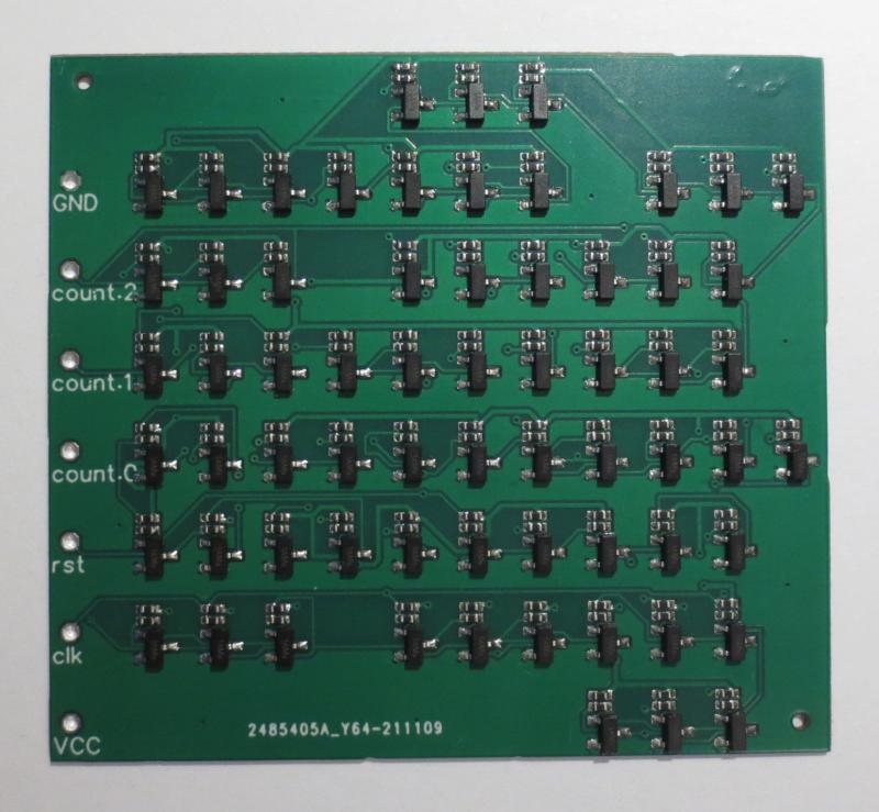 The flow is, of course, not limited to resistor-transistor-logik. In the meantime, I implemented analog multiplexer logic and already received a first PCB with the counter implemented in that logic style. The generated PCB is shown below. The analog multiplexers (BL1551) come in a tiny SC70 package and leave ample space for routing. The implementation of logic gates with multiplexers is quite efficient, hence only 26 devices are needed.