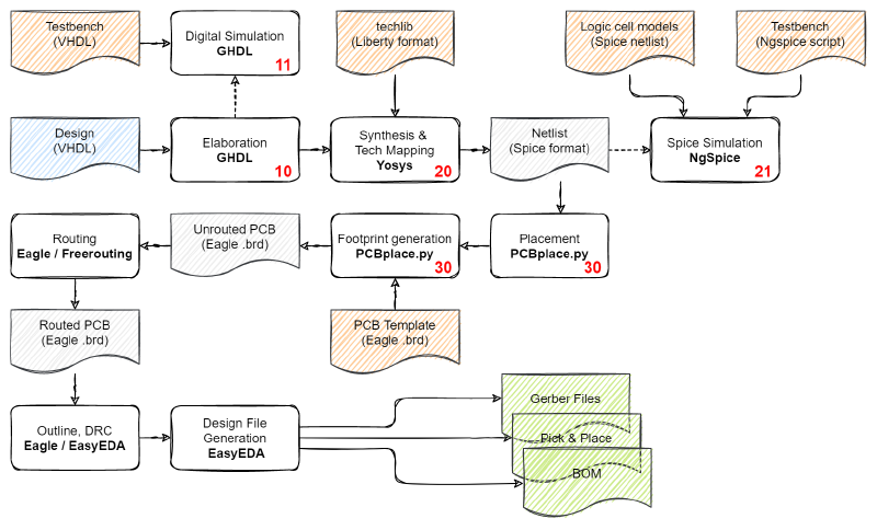 The diagram above shows how the individual steps of the flow are connected. The starting point is the design (A VHDL source file) in the blue file box. In subsequent steps, this design will be transformed by various tools into new intermediate representations (grey). To aid this, technology description files and testbenches are needed (orange). The output at the end of the flow are the three green files, which describe the PCB layout (Gerber), the part list (BOM) and where the parts have to be placed on the PCB (Pick & Place).