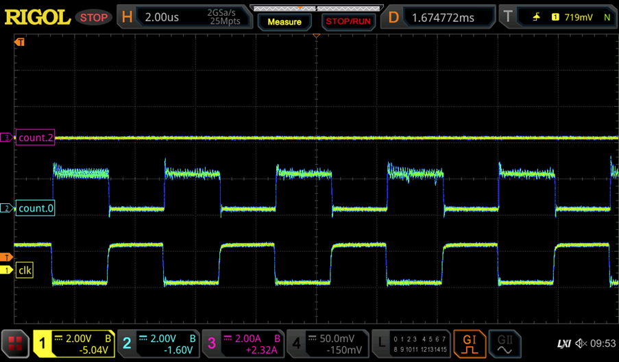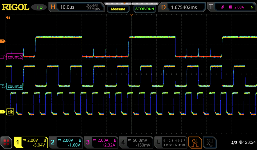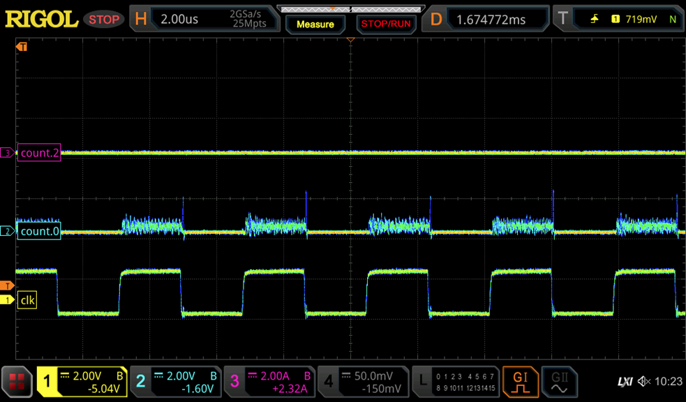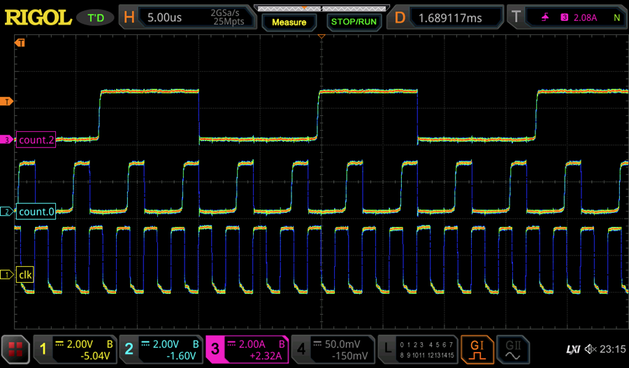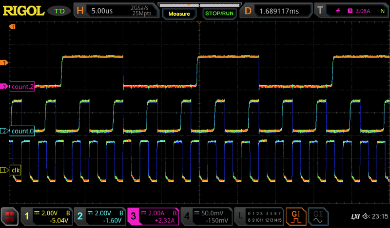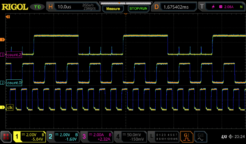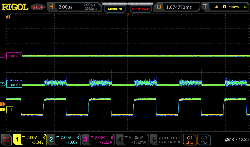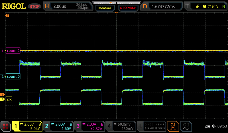 Unfortunately something turned out to be not quite right with the circuit. The scope image below shows the clock signal after the first inverter (count.0). This seems to work well, but the “high” state is unusually noisy, suggesting that something is oscillating and contaminating the supply rail.