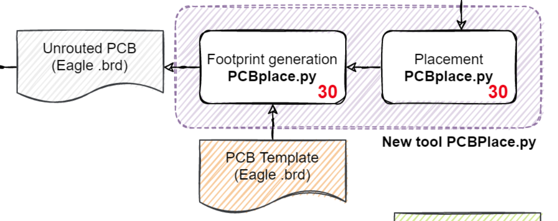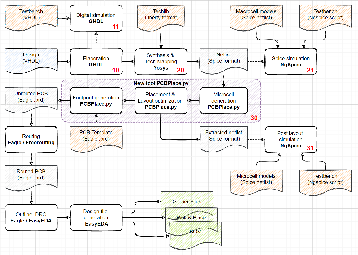 The image above shows the updated flow with the step of microcell generation being made more visible. The PCBPlace.py tool will now automatically extract a spice netlist after microcell generation, placement and layout optimization. The extracted netlist can then be simulated (Script 31) with NgSpice to spot any errors in microcell generating or during subsequent optimization steps.