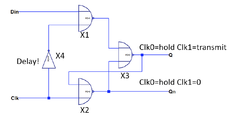 You will notice that the DFF requires a whopping 15 transistors. This is indeed the minimum number of transistors for a “clean” DFF, as you will see later. There are some options to reduce this down to 7-8.