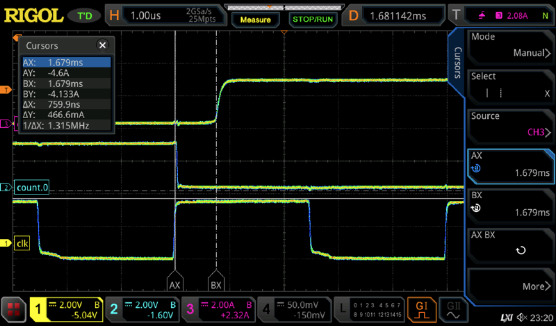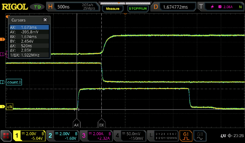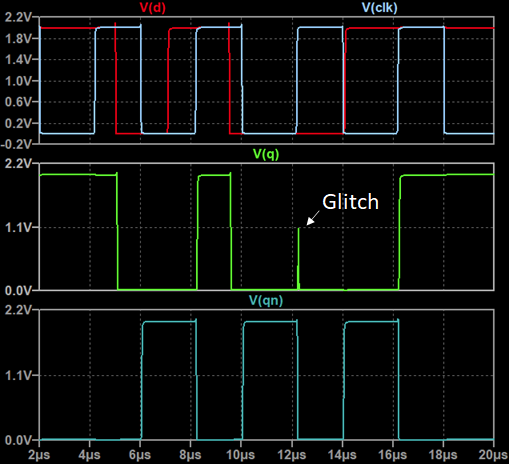 Operation of the counter is fine, as can be seen above. The three transistor pass-gate latches do not exhibit any spikes, which is much nicer. One can see a bit of crosstalk though (most likely through the pass transistor), which was also visible in the simulations.