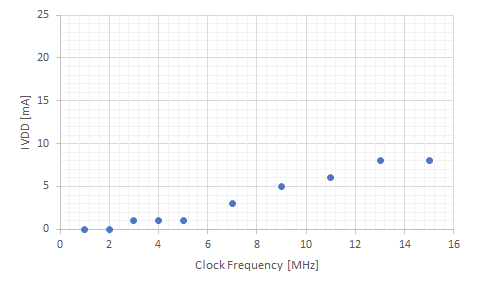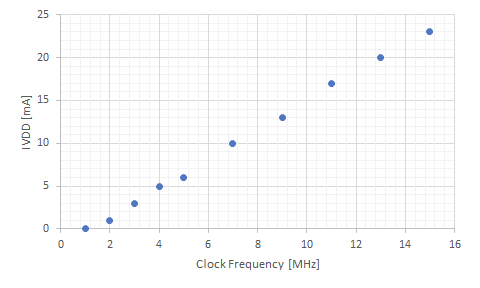 As a consequence, the current consumption is proportional to the clock frequency, as shown above.