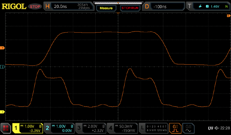 Details show that the clock to data latency is <20 ns for a rising output while it is >40ns for a falling one.