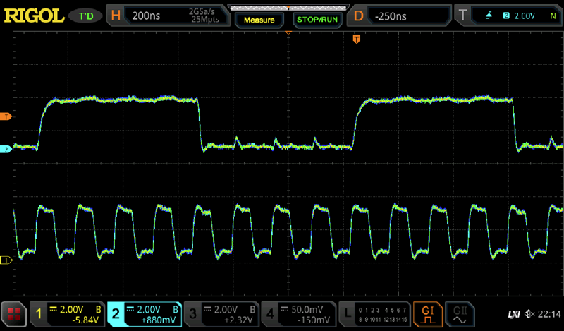 I elected to go with a rather low load and base resistance to achieve maximum speed in this implementation. This results in a static current draw of 238mA. Furthermore, the signal generator in my scope with not able to drive the clock signal anymore due to too high load. I had to introduce as SN7407 as clock buffer.