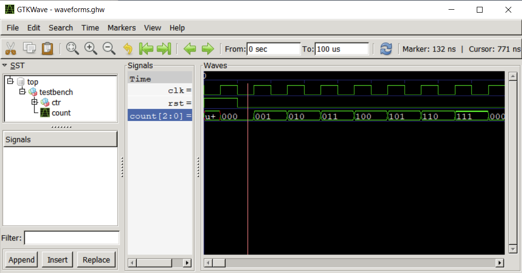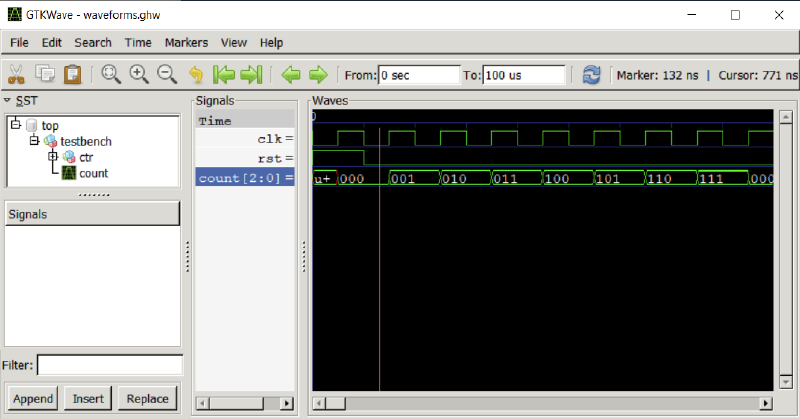 Digital simulation is quite straightforward. GHDL is well established here. I implemented a simple counter in VHDL to use an example for flow development. The source code is shown in the figure below and simulation traces from the testbench at the bottom of the page.