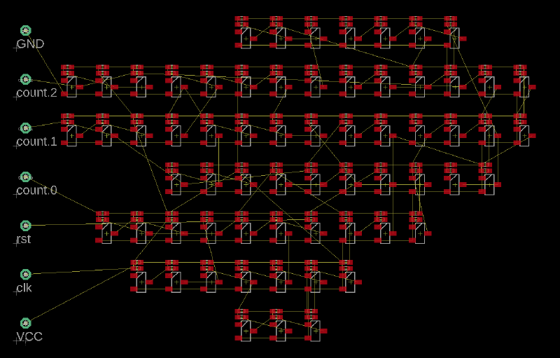 So what went wrong here? I did indeed skip a step in my earlier description of the flow. The problem is that Yosys does not really know about analog multiplexers or transistors. Hence I introduced a step between Yosys and the actual placement of the components on the PCB. Yosys/GHDL is generating basic logic gates as output (e.g. NAND, NOR). The first pass of my PCBPlace.py tool is to break down these gates into “Microcells”, the actual components that are being placed on the PCB. In this case, between 1 and 5 analog multiplexers are generated per gate. Turns out I made a mistake that was difficult to spot in the microcell implementation of the latch. The only way to detect this, would have been to manually retrace the PCB layout.