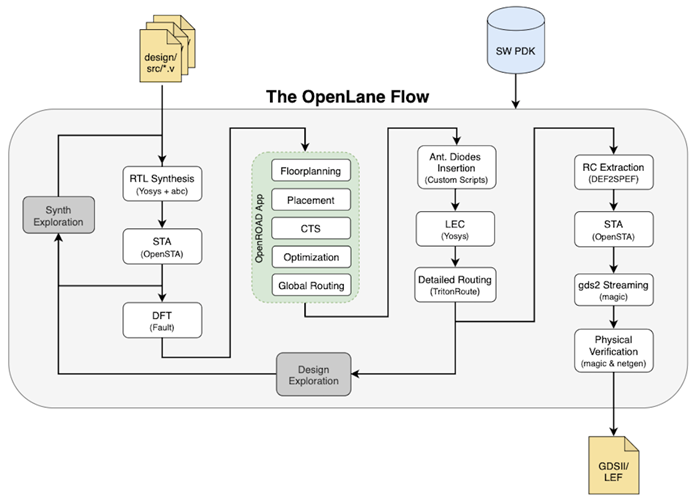 The image above shows the architecture of the OpenLane Flow (taken from here). The input to the flow is a our design file and a description of the technology, the PDK. At each step in the flow, the design is transformed in some way and saved in an internal representation until finally a layout file is generated. There are some feedback loops were tools parameters have to be finetuned to optimize the result.