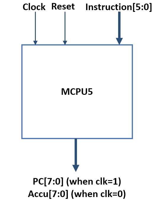 Two of the input pins are used for clock and reset, the remaining ones are reserved for instructions and are six bit in length. The output is multiplexed between the program counter (when clk is ‘1’) and the content of the main register, the Accumulator. Accessing the Accumulator allows reading the program output.
