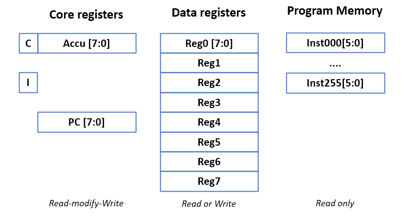 All data operations are performed on the accumulator. In addition, there are eight data registers. The data registers are implemented as a single port memory based on latches, which significantly reduced are usage compared to a two port implementation. The Accu is complemented by a single carry flag, which can be used for conditional branches.